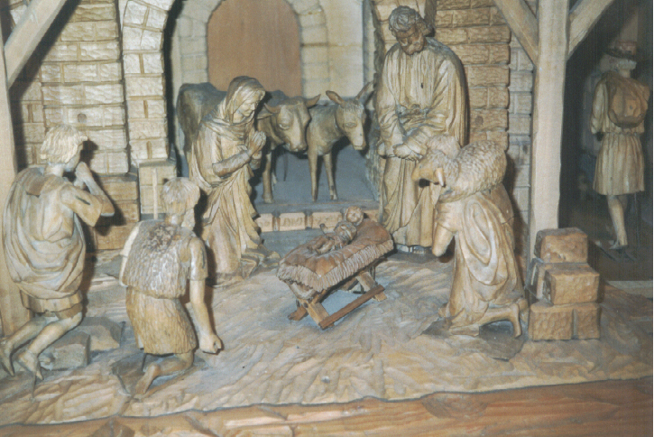 Langsam kommen wir zu dem Hauptteil der Weihnachtskrippe zu der Krippe selbst. Herr Utz hat ihn großzügig gefaßt, ohne Angst, daß er für das mechanische Problem vielleicht keine Lösung findet. Der Hauptteil ist gekrönt mit den am schönsten geschnitzten Figuren. Bei der bildnerischen Gestaltung war er, so wie bei der gesamten Krippe, eher konservativ. Künstlerisch hat er nicht das Niveau eines begabten Amateurs überschritten, aber in Verbindung mit der technischen Qualität wirkt seine Krippe sehr suggestiv. Die traditionelle Szene der Heiligen Familie mit Tieren im Hintergrund und drei Hirten, die das kleine Kind begrüßen kommen, ist mit mehr als 10 beweglichen Teilchen der einzelnen Figuren besetzt. Außerdem gelang es Herrn Utz, in die Konstruktion einen kleinen Leckerbissen einzubauen: